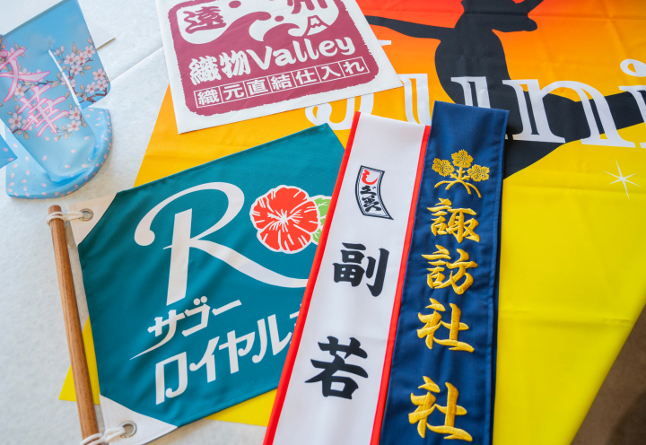 店舗用のれんや日よけ幕、のぼり旗、オーダーメイドタオル、横断幕など。様々な素材の生地にプリントが可能です。