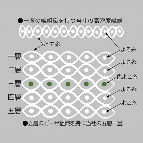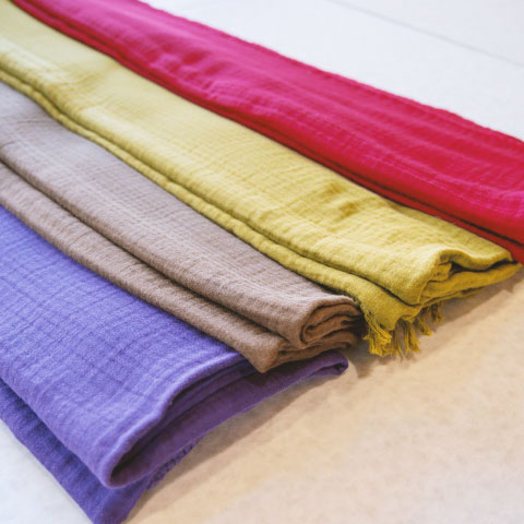 遠州ガーゼは布の製造難易度が高い織物であり、独特の凹凸を表現する為に高級糸を高密度で織り上げています。三層と五層のガーゼを先染め織と後染め織の2種類で対応しており、ニーズに合わせた製品の制作が可能です。